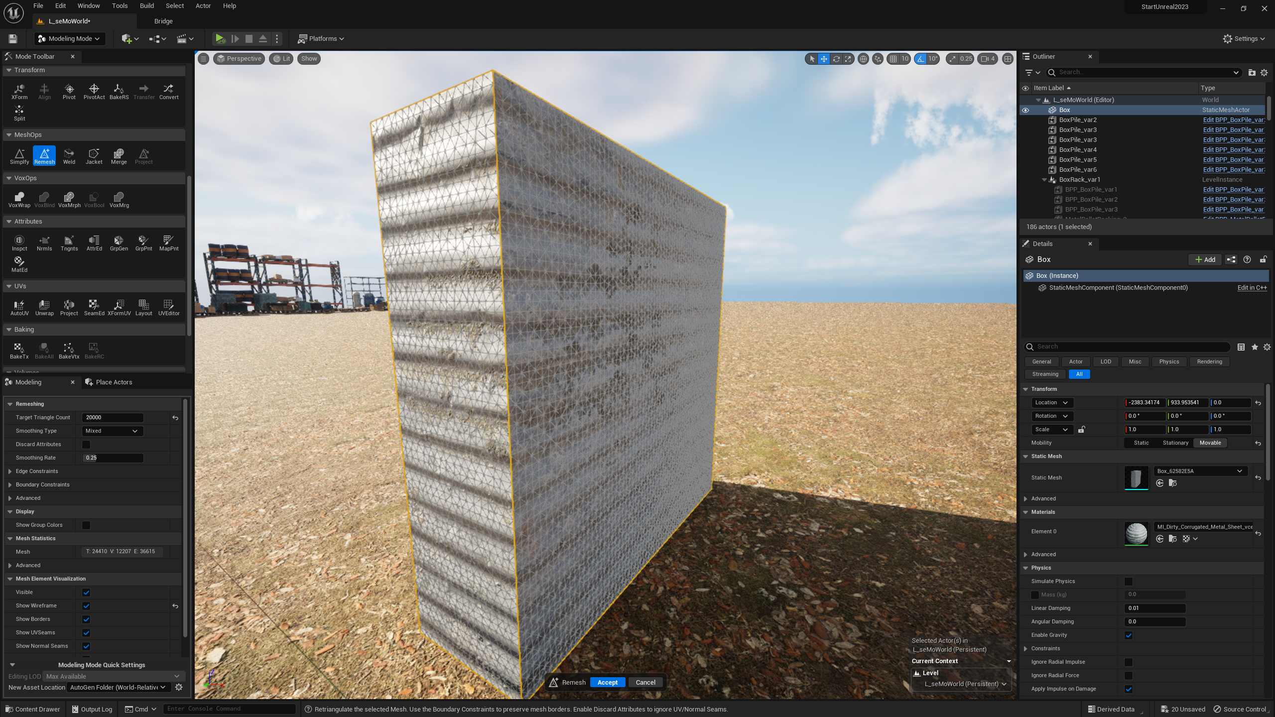 실제 굴곡을 만들기 전에, 굴곡을 표현하기 위해선 Static Mesh의 폴리곤 갯수가 굉장히 많이 필요하다. 따라서 모델링 모드로 돌아가 MeshOps > Remesh를 선택한 후, 상자모양 액터를 선택하고 Target Triangle Count를 20000으로 늘려준 뒤 Accept를 눌러주자.