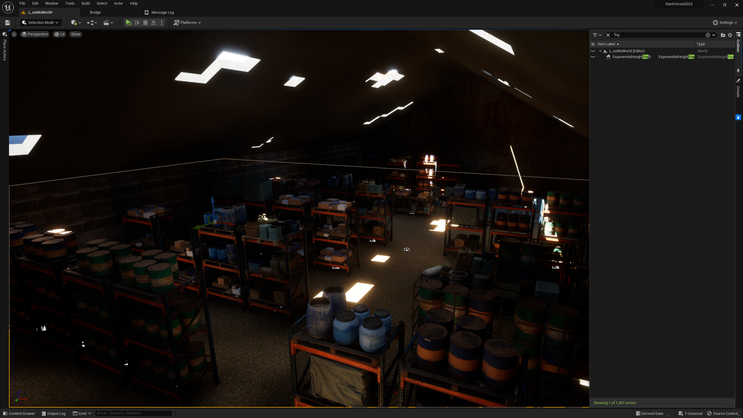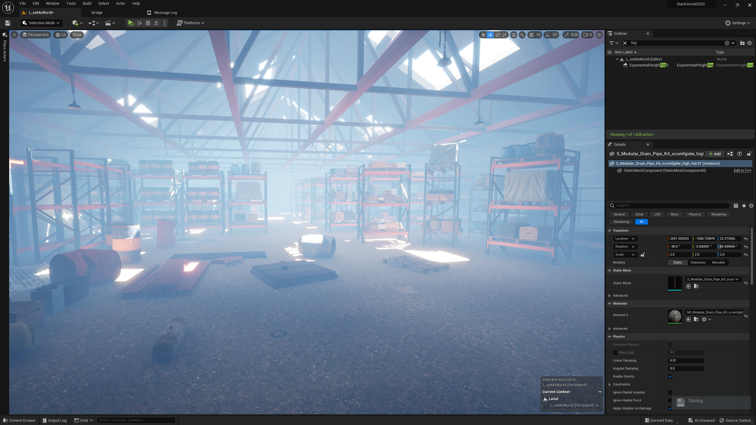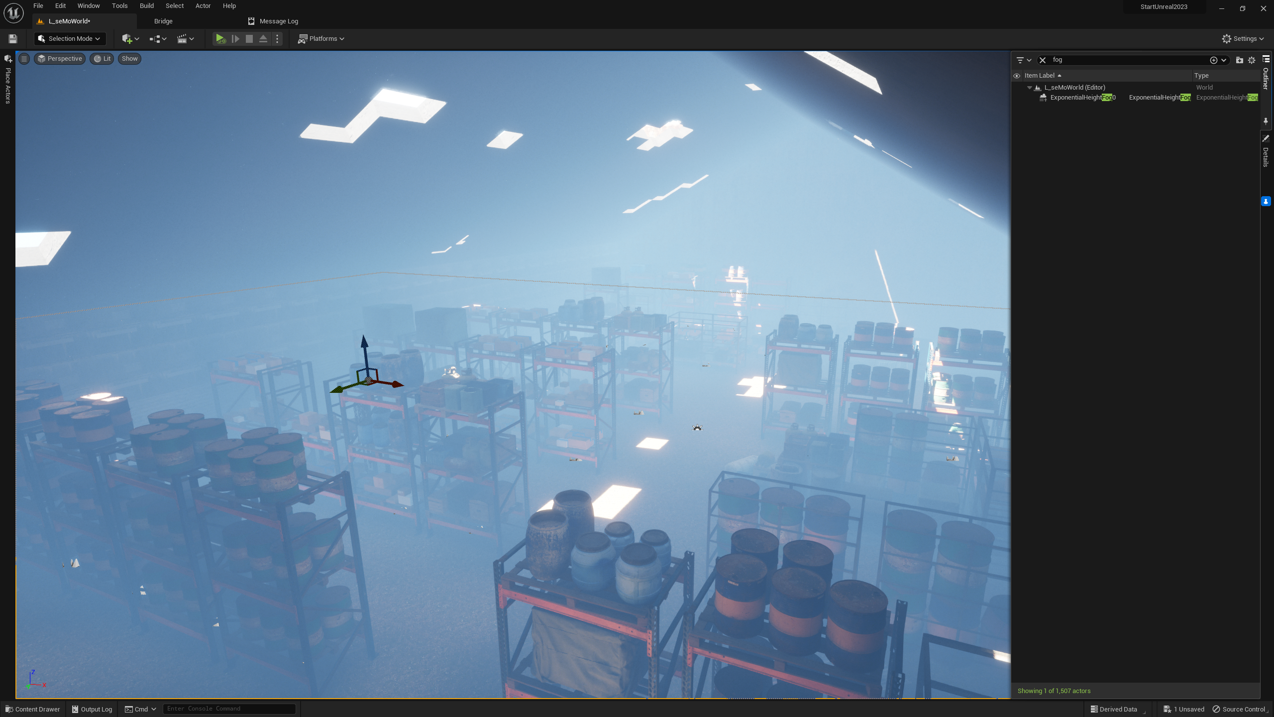 그 전에, 공장 내부에 푸른 안개같은 것이 자꾸 시야를 가려서 작업하는데 불편함을 느낀다면 Outliner에서 Fog를 검색하여 ExponentialHeightFog 를 찾아 좌측의 눈모양 아이콘을 꺼주자.