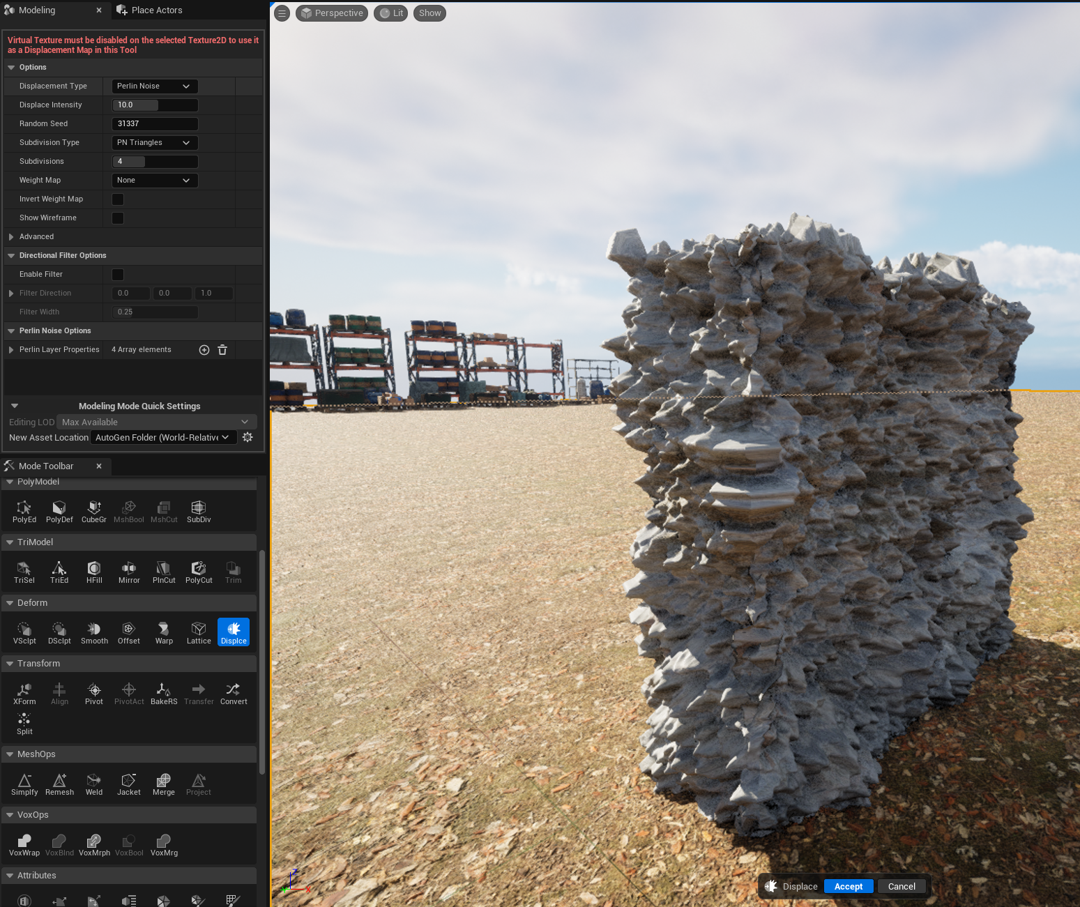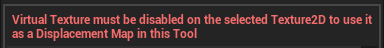 할당하고나면 버추얼 텍스쳐는 이 툴에서 Displacement Map의 텍스쳐 2D로서 사용할 수 없으니 비활성화 하라는 문구가 표시된다. 다행히도 이전에 했던 것 처럼 프로젝트 기본 설정을 바꿀 필요는 없다.