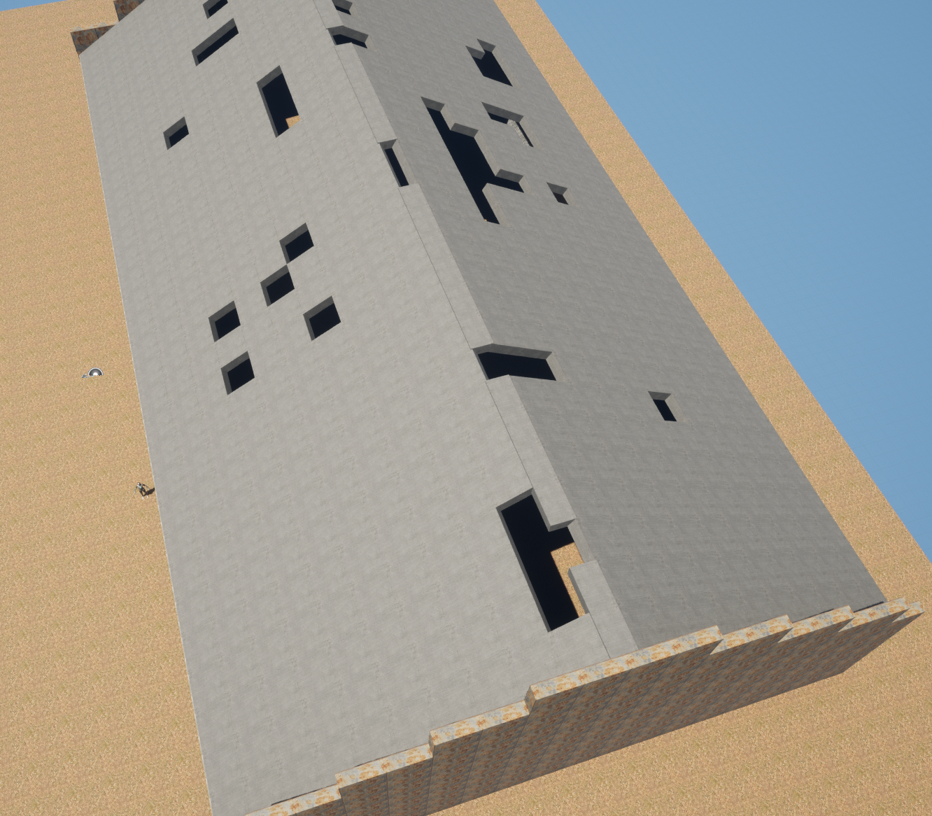 적당히 이어붙이다가 상하로 4층의 타일을 쌓게됐는데, 3층 이상부턴 Japanese Concrete Panels를 기반으로 생성한 Static Mesh와 머티리얼을 사용하였다. 이렇게 단조로운 연출보단 조금 다른 머티리얼을 섞어가며 배치하면 보기좋게 연출할 수 있다.