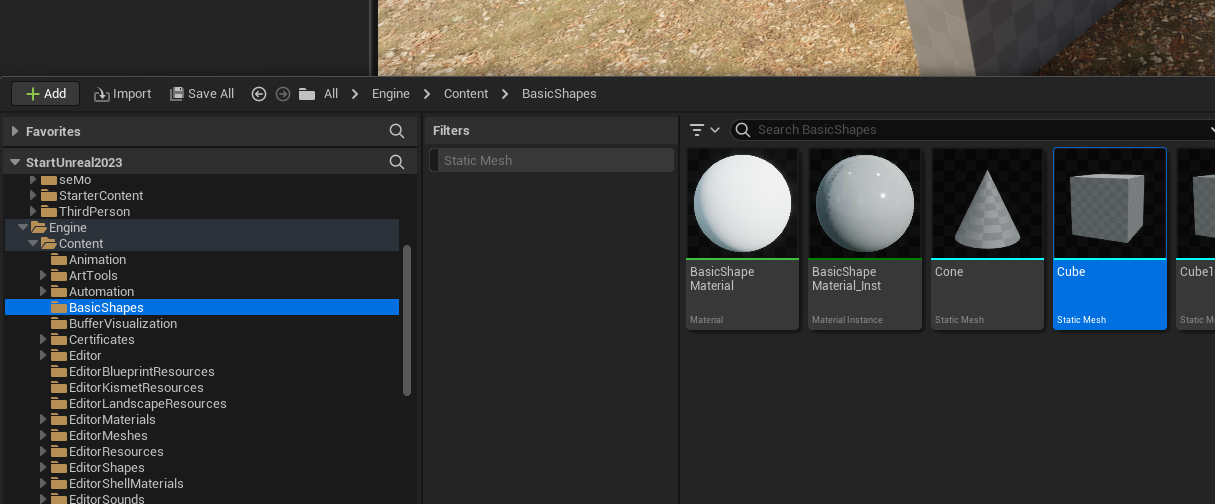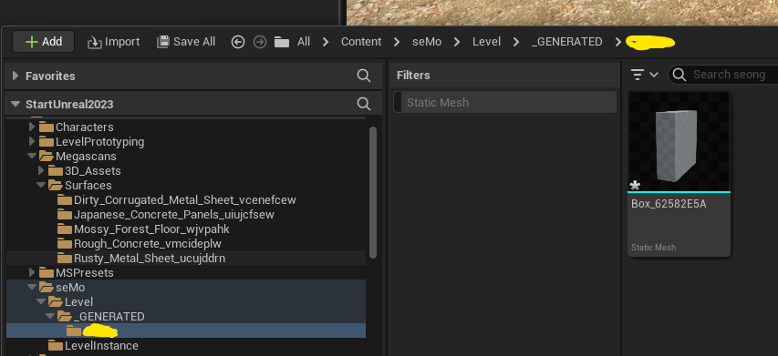 따라서 Ctrl + B를 통해 프로젝트 내의 어떤 위치에 존재하는지 살펴보면, 액터 배치를 통하여 생성한 액터들은 Engine > Content > BasicShapes에 존재하지만, 모델링을 통해 생성한 에셋은 seMo > Level > _GENERATED > 사용자 이름 폴더 하위에 생성된 것을 확인할 수 있다.