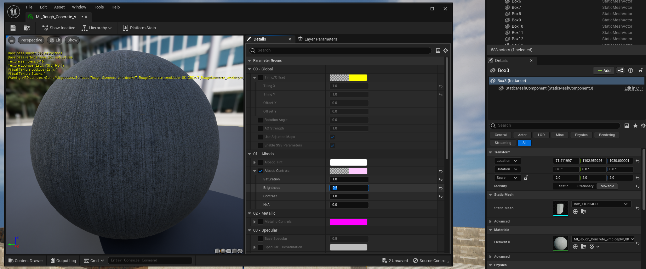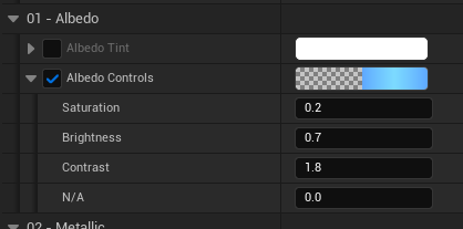 콘크리트 타일의 Details > materials > Element 0 에 있는 머티리얼을 더블클릭하여 머티리얼 편집기를 연다. 머티리얼 편집기에서 01 - Albedo > Albedo Controls > Brightness 의 값을 낮춰주면 콘크리트 타일의 밝기를 수정할 수 있다.