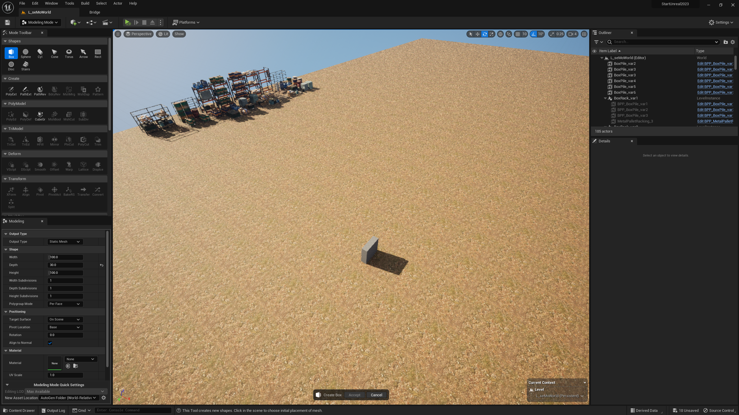 이후 과정은 모델링 모드를 이용하여 새로운 에셋으로 만들어 진행하는 것을 권장한다. 액터 배치 패널에서 큐브를 사용하여 스케일 변경 등으로 만들어나가면 문제가 생길 수 있다고 한다.