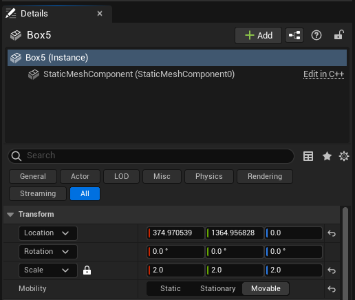 이렇게 원본의 Static Mesh가 변하는 작업이기 때문에 액터 배치에서 Cube를 가져와 작업하면 안된다는 것이었다. 기본 액터인 Cube가 변형될 수도 있기 때문에.