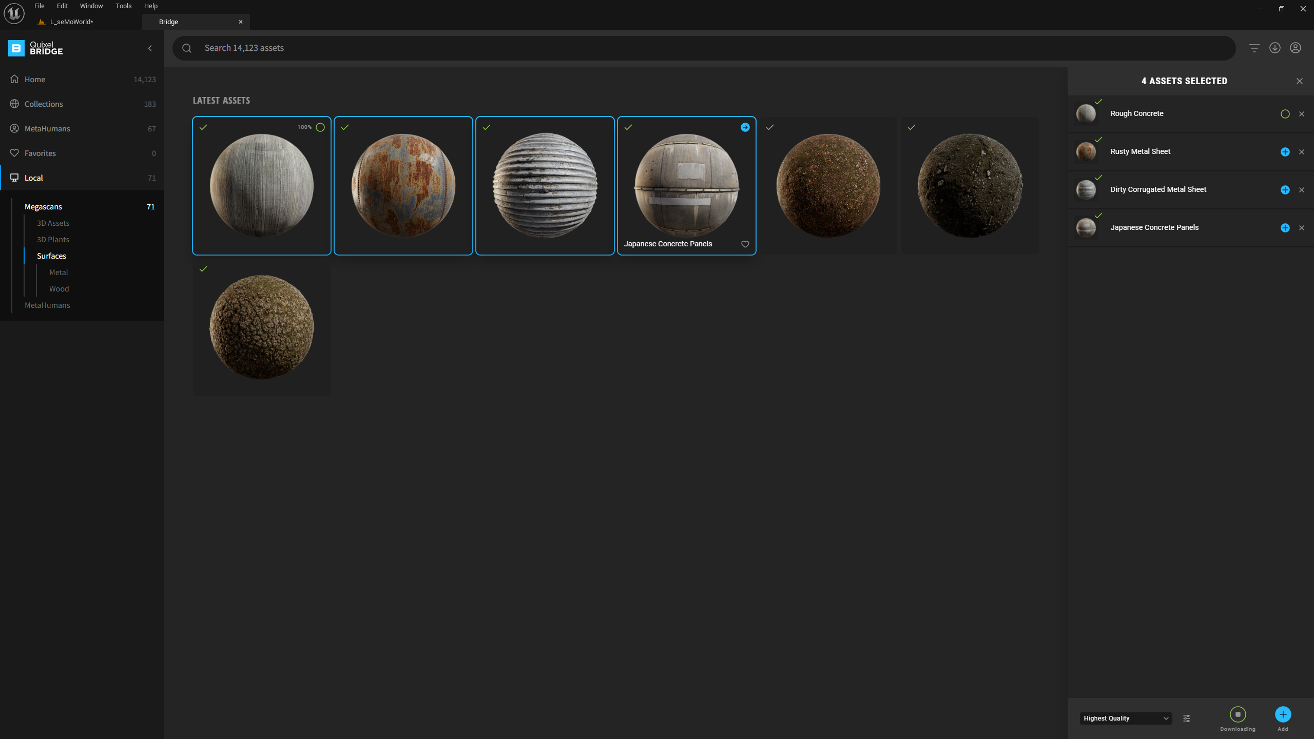 우선 공장의 구조를 세울 것이다. 공장의 구조를 세우는데, 조금 특별한 방법을 사용할 것이다. Nanite를 활용해 높은 퀄리티로 표현되는 공장의 벽면을 만들 것이다. 공장의 벽면을 표현할 데이터가 필요하기 때문에 Quixel Bridge에서 에셋을 다운받자.
