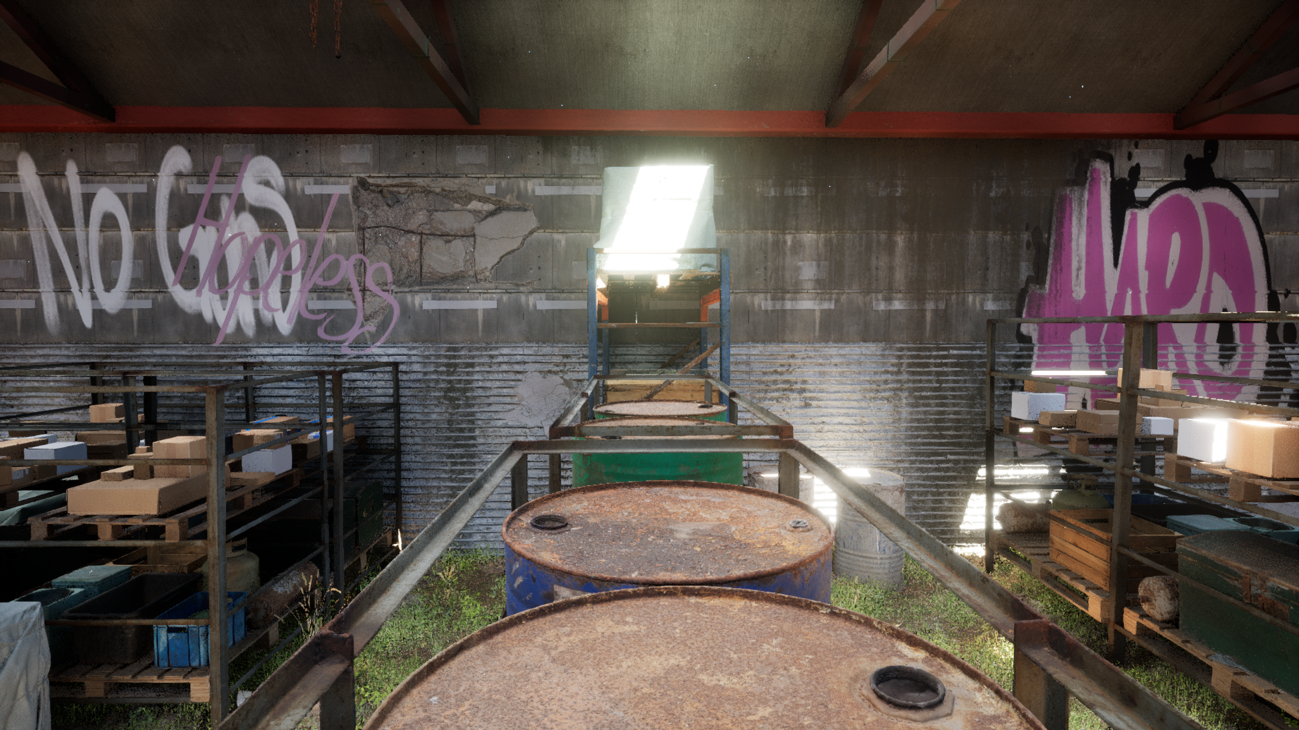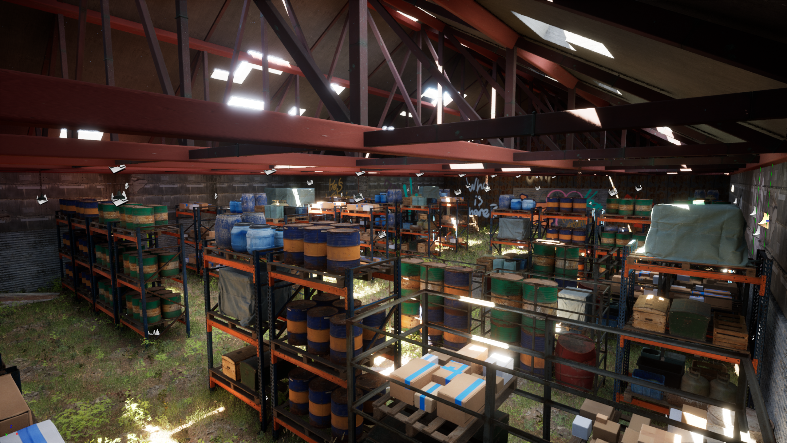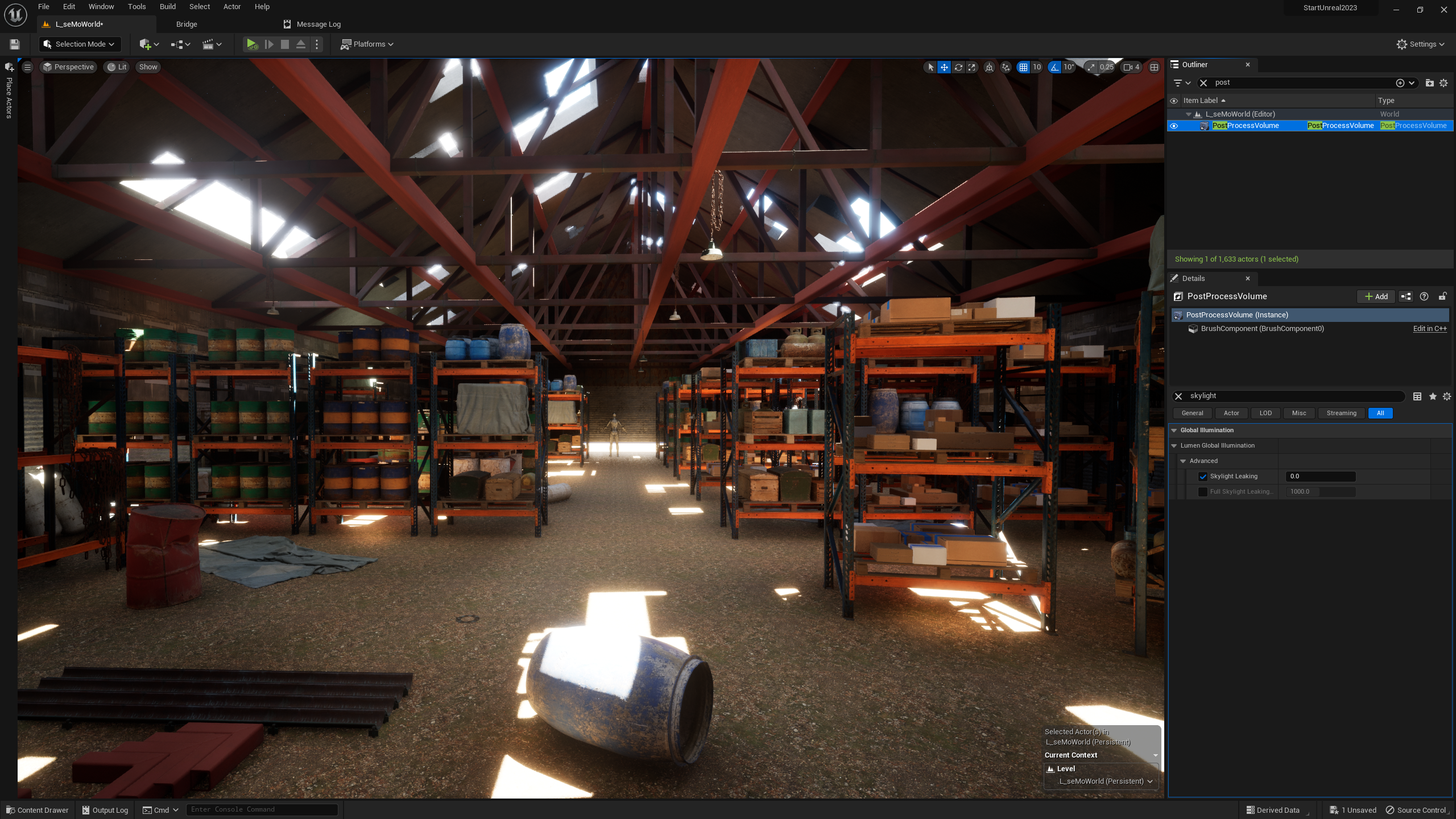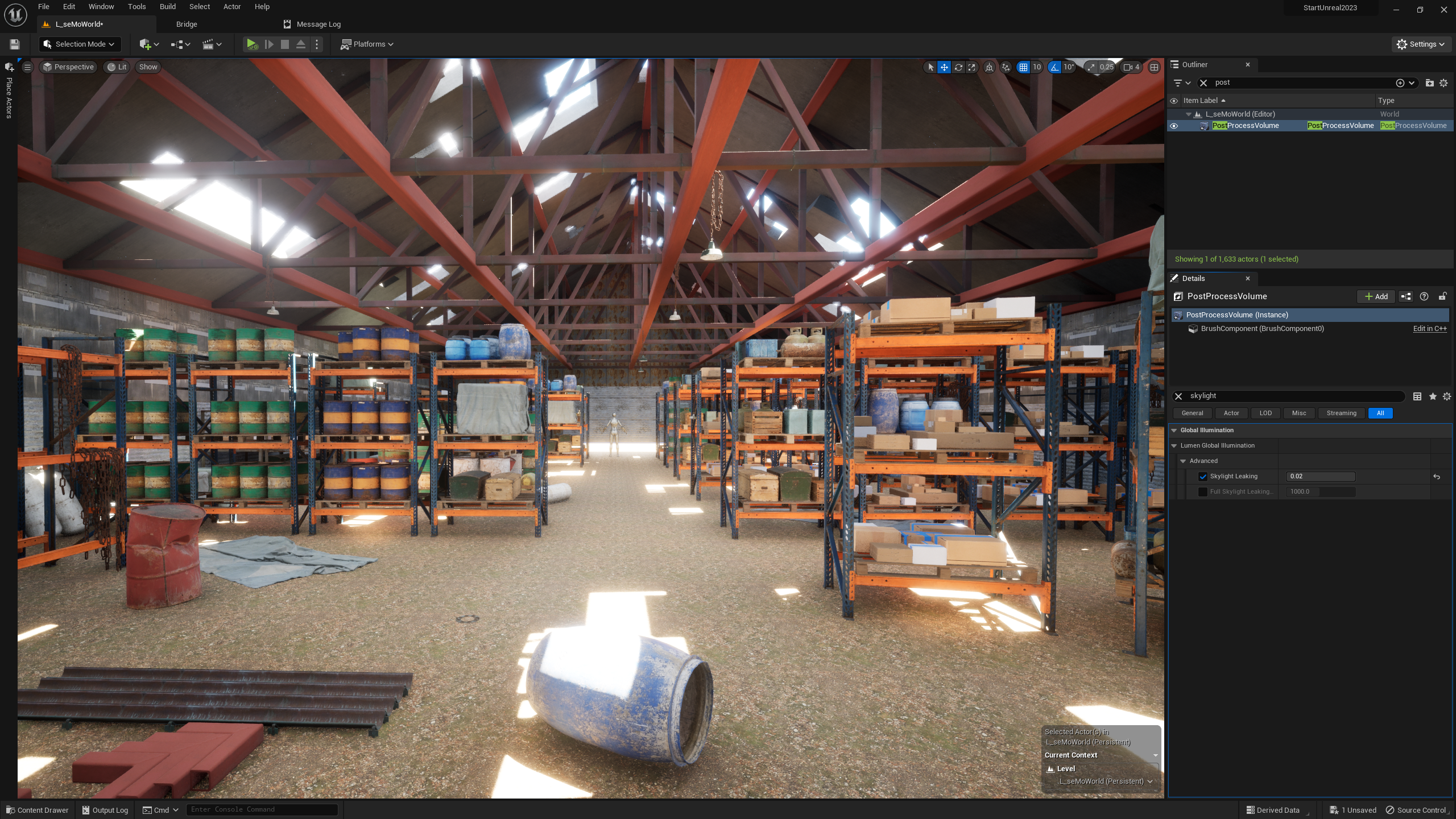 다시 Details 패널에서 Skylight를 검색하여 Skylight leaking을 조절하자. 이것은 빛이 밀폐된 공간에 비치는 정도를 설정하는 수치인데, 보다시피 최대로 올려도 0.02정도로 굉장히 낮은 수치이다. 하지만 이 설정을 통해 어둡던 공장 내부를 밝게 연출할 수 있으니 적당히 조절하자. 나는 지난 시간에 어두워서 더 뚫었던 천장의 구멍들을 메꾸고 Skylight를 조절했다.