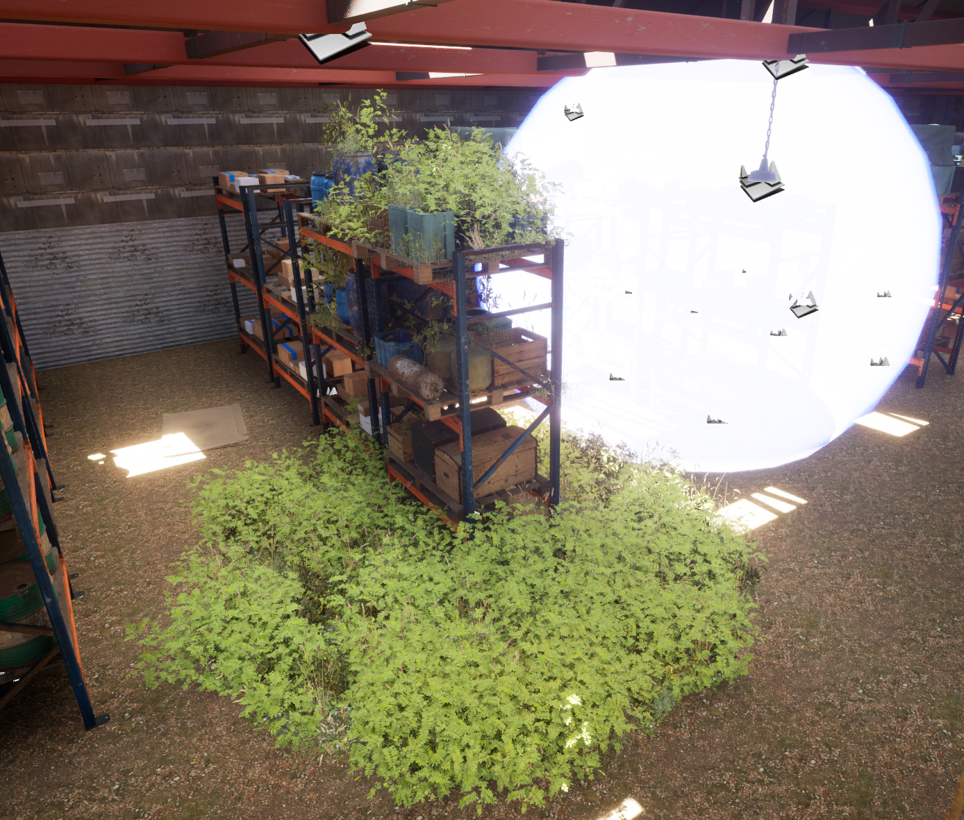 그렇다면 공장 내부뿐만 아니라 바닥(Plane) 전체에 식물들이 깔리는 것을 볼 수 있다.