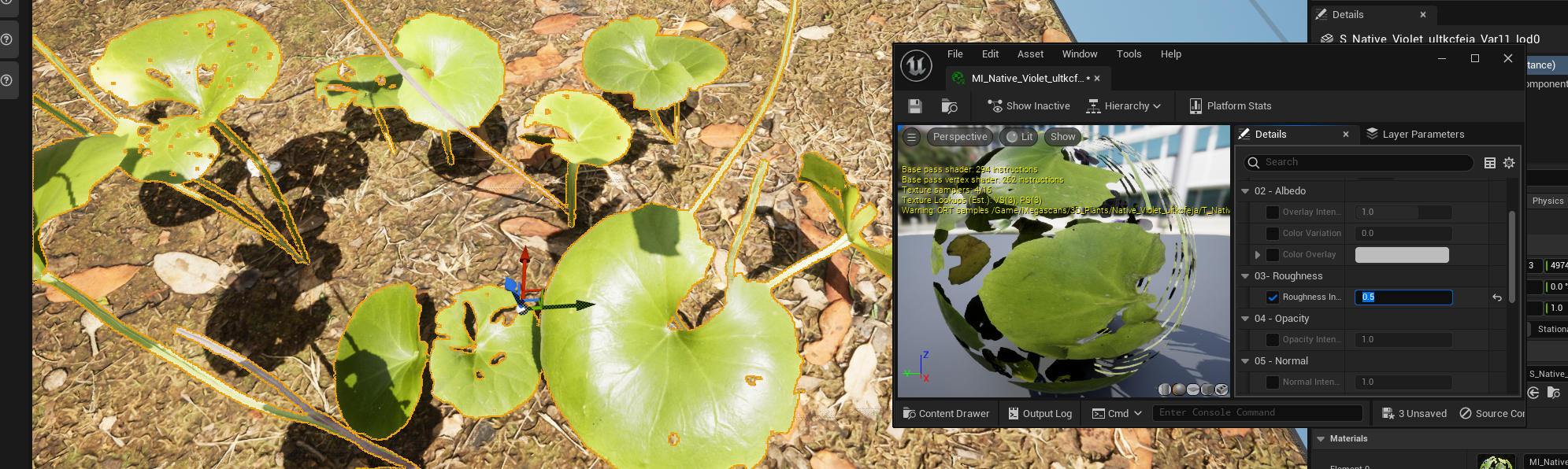 식생의 머티리얼에서 Roughness를 살펴볼건데, Roughness란 거친 질감이 표현되는 정도를 정하는 영역이며, 이것이 낮으면 매끈한 표면이 표현되어 물에 젖거나 빛반사를 잘 하는 모습을 연출할 수 있다. 위 사진에서는 Roughness 1과 Roughness 0.5를 비교하는 모습이다.