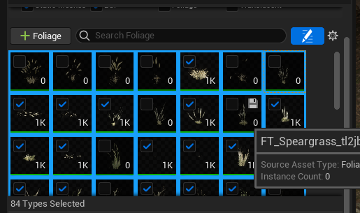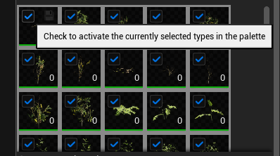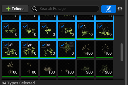 모두 선택하는 방법은 간단하다. 폴리지 패널의 폴리지들 중 아무거나 하나를 선택하고 Ctrl + A를 누르면 전체 선택이 된다. 그리고 폴리지 에셋에 마우스를 올려 체크박스가 나타나면 체크해주자. 그럼 모든 에셋이 다 체크가 될 것이다. 여기서 선택된 에셋은 Foliage 모드에서 배치가 될 것이며 만약 따로 배치를 하고싶거나 배치를 원하지 않는 에셋이라면 체크를 해제하자.