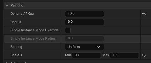 그리고 Painting > Scale X를 조절하면 지정한 범위 내에서 에셋의 크기가 무작위로 설정되어 배치된다. Min 1, Max 1일 때 보단 훨씬 자연스러운 모습이 될 수 있다.