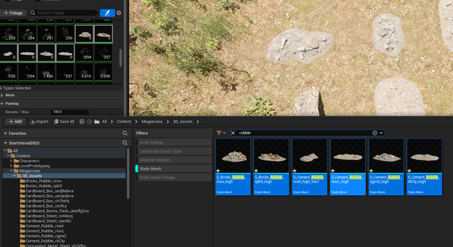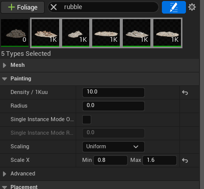 다만 아쉬운 점은, Plane에 적용한 Material과 톤이 달라 방금 배치한 Rubble Foliage들이 너무 밝다는 것이다. 물론 이 부분은 앞서 식생배치를 하며 수정했듯이, Rubble의 Material을 수정하여 톤을 맞춰줄 수 있다.