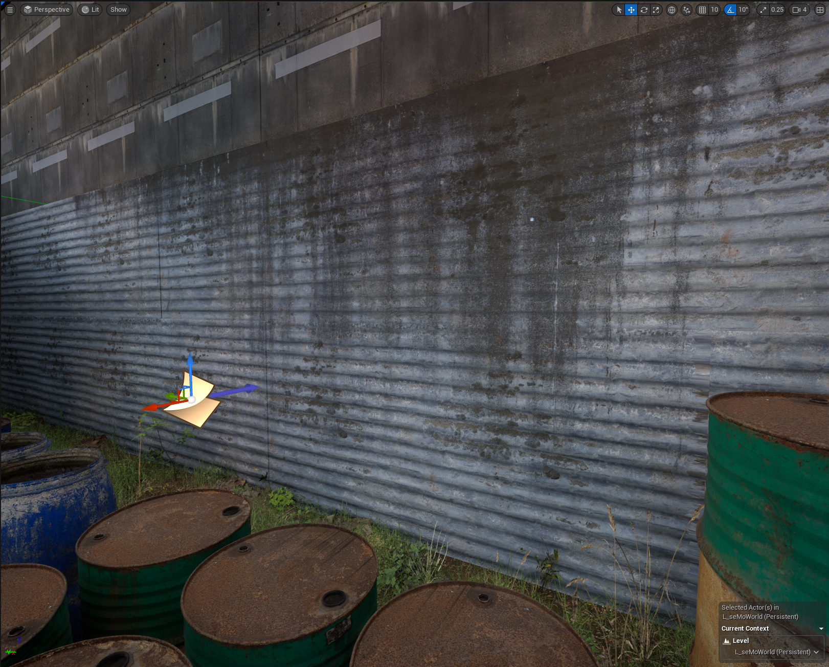 데칼의 Gizmo는 위와 같이 생겼다. X, Y, Z축을 나타내는 기즈모 외에 1개가 더 있는데, 이것은 데칼이 적용되는 방향을 나타낸다. 따라서 위 사진에서는 보이는 희색 주름진 벽에 데칼이 적용되는 것이다. 이것은 Gizmo를 통해 회전시키고 이동하여 적용할 수 있으며, 마찬가지로 Scale의 변경이 가능하다.