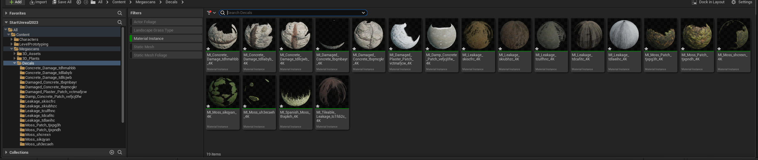 Decal 에셋을 한번에 모아서 보는 방법은 Content Browser에서 Decal 폴더를 선택한 뒤, Material Instance를 필터링해주면 한 눈에 데칼을 볼 수 있다.