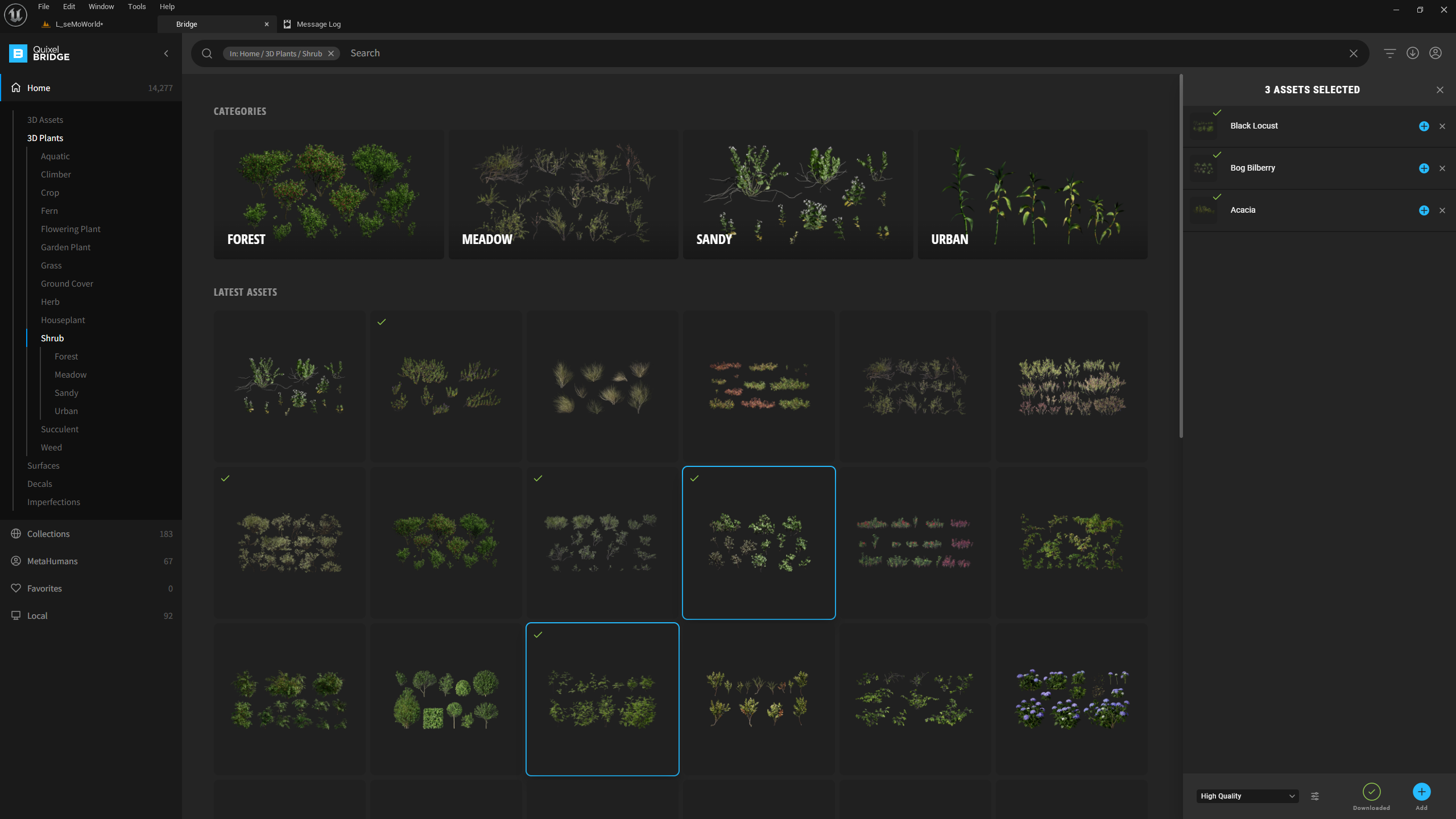 식생은 Highest > High > Medium > Low 로 품질이 좋은데, 식생의 경우엔 8k로 표현되는 Highest와 4k로 표현되는 High, 2k인 Medium 의 육안으로 봤을 때 차이가 크게 나지 않아 용량을 줄이고 싶다면 High 또는 Medium을 다운받아 사용하면 된다. 영상에서는 High를 사용한다.