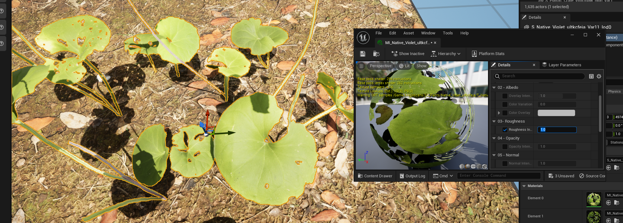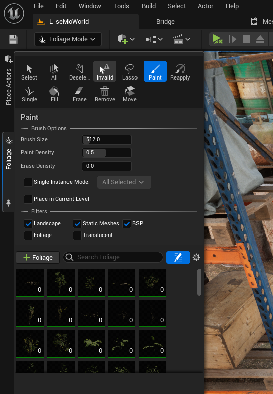 이제 배치된 식생들을 조금 수정할 것이다. 배치된 폴리지들 또한 스태틱 메시와 머티리얼로 이루어진 에셋이므로, 머티리얼을 수정한다면 맵에 배치된 폴리지 또한 일괄 수정된다.