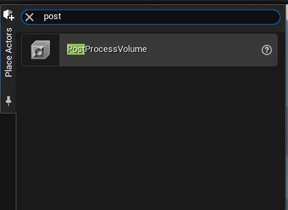 Place Actors 패널에서 post를 검색하여 PostProcessVolume을 찾아 환경에 배치해주자.