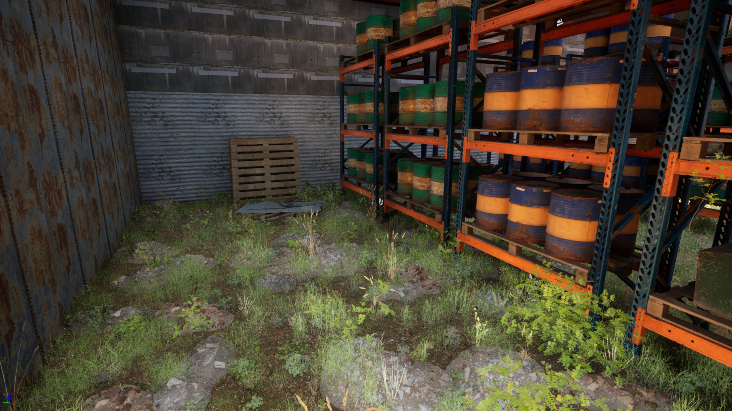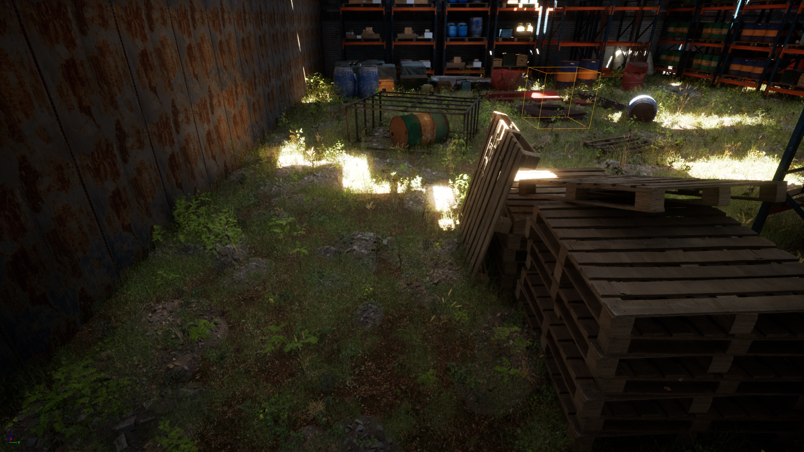 이제 공장 내부에 폴리지를 깔아보면, 배치한 Static Mesh들 위에도 깔리는 것을 볼 수 있다. 하지만 만약 바닥에만 깔리는 것을 원한다면, 설정을 수정하여 원하는 바를 구현할 수 있다.