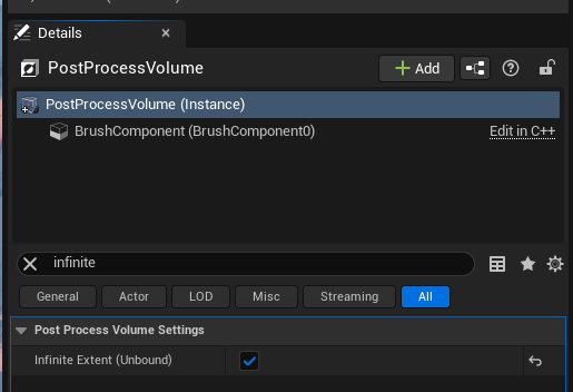 포스트 프로세스 볼륨의 Details 패널에서 Infinite Extent(무한 규모)를 검색하여 체크해주자. 이것이 활성돼야 앞으로 적용시키는 변화들이 월드 전체에 적용된다.