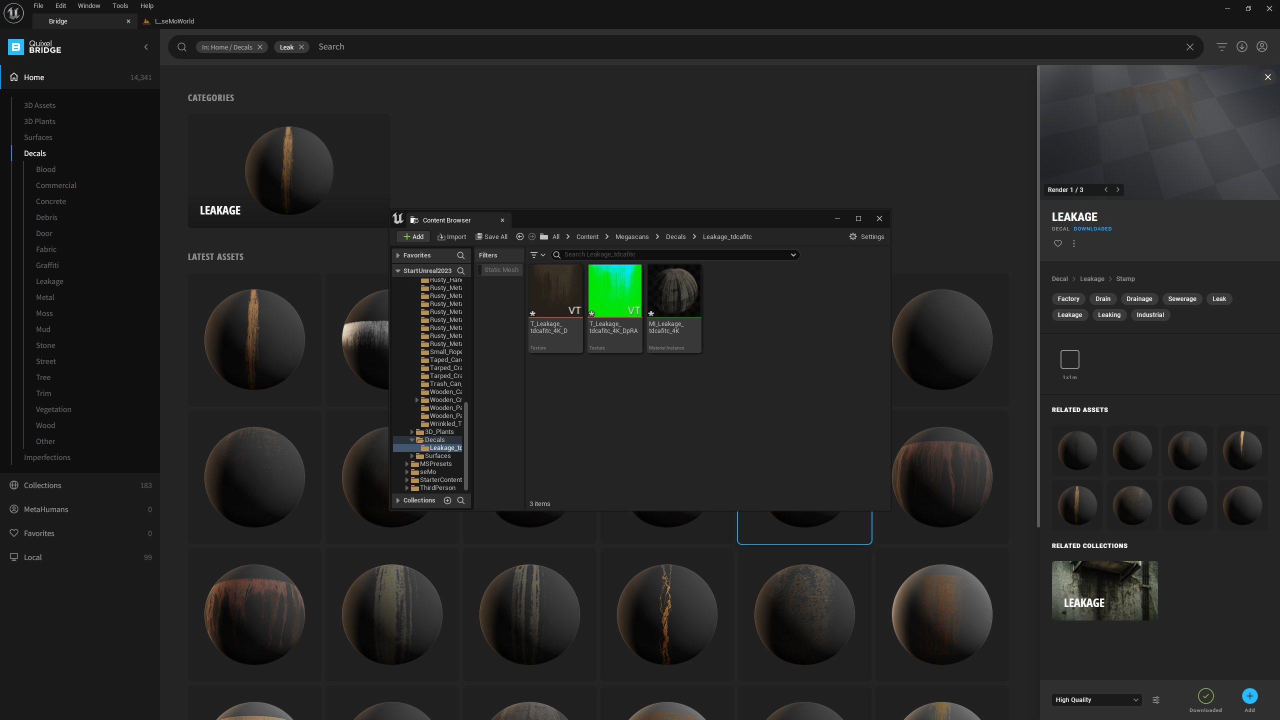 여기서 Leak을 검색하여 하나를 받아보자. 이것은 녹슨 표현을 하는 데칼이며, 용량 절약을 위해 한단계 낮춘 품질로 받았다. (데칼의 경우 품질이 낮아도 다른 에셋에 비해 크게 티나지 않는다)