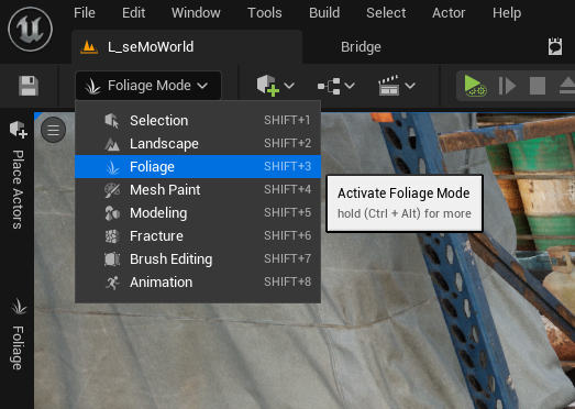 Viewport 좌상단의 Selection 모드에서 Foliage 모드로 변경하자. 기본 단축키로는 Shift + 3이다.