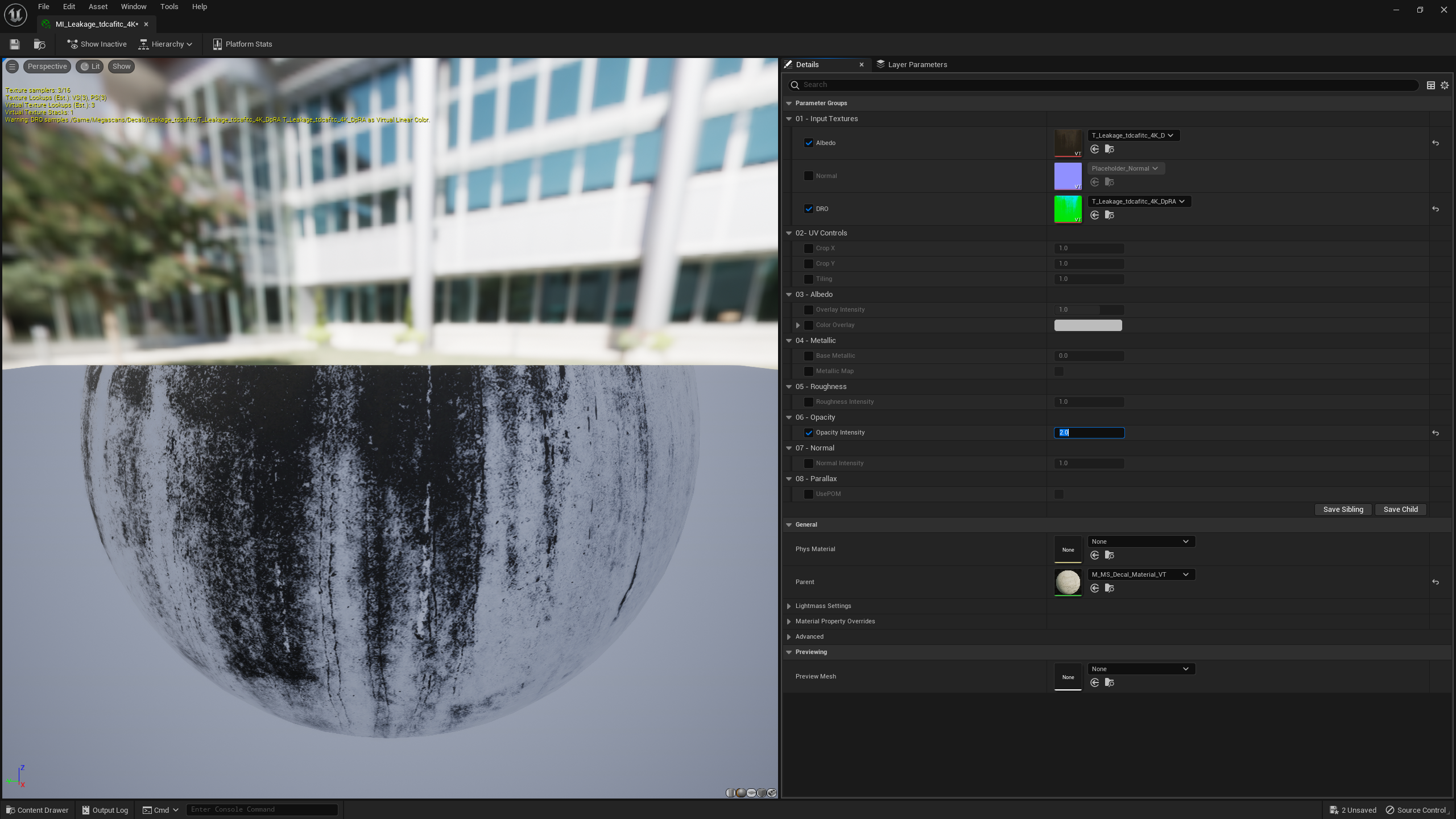 그리고 Decal 역시 머티리얼이기 때문에 편집기를 통해 여러 속성을 조절할 수 있는데, 이 중 Opacity Intensity(불투명도)는 데칼을 얼마나 진하게 표현할 것인지에 대한 변수라고 볼 수 있다. 이것이 높을수록 표현은 짙어진다.