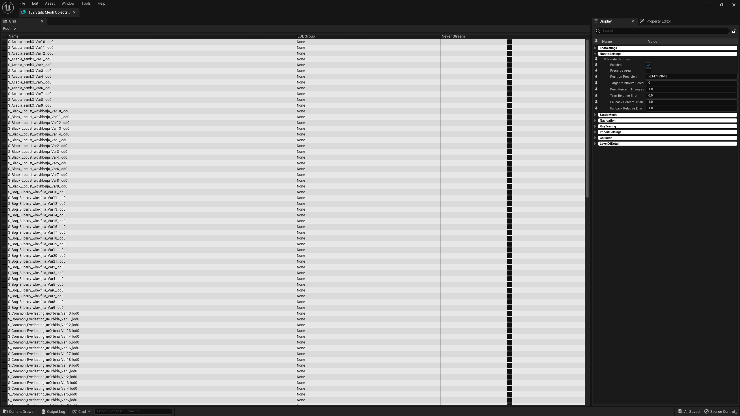 이렇게 나나이트가 활성되지 않고 LOD가 표현되는 식생들에 나나이트를 적용시켜주자. Content Browser에서 Megascans > 3D Plants 하위의 모든 Static Mesh를 선택하여 나나이트를 적용하자.