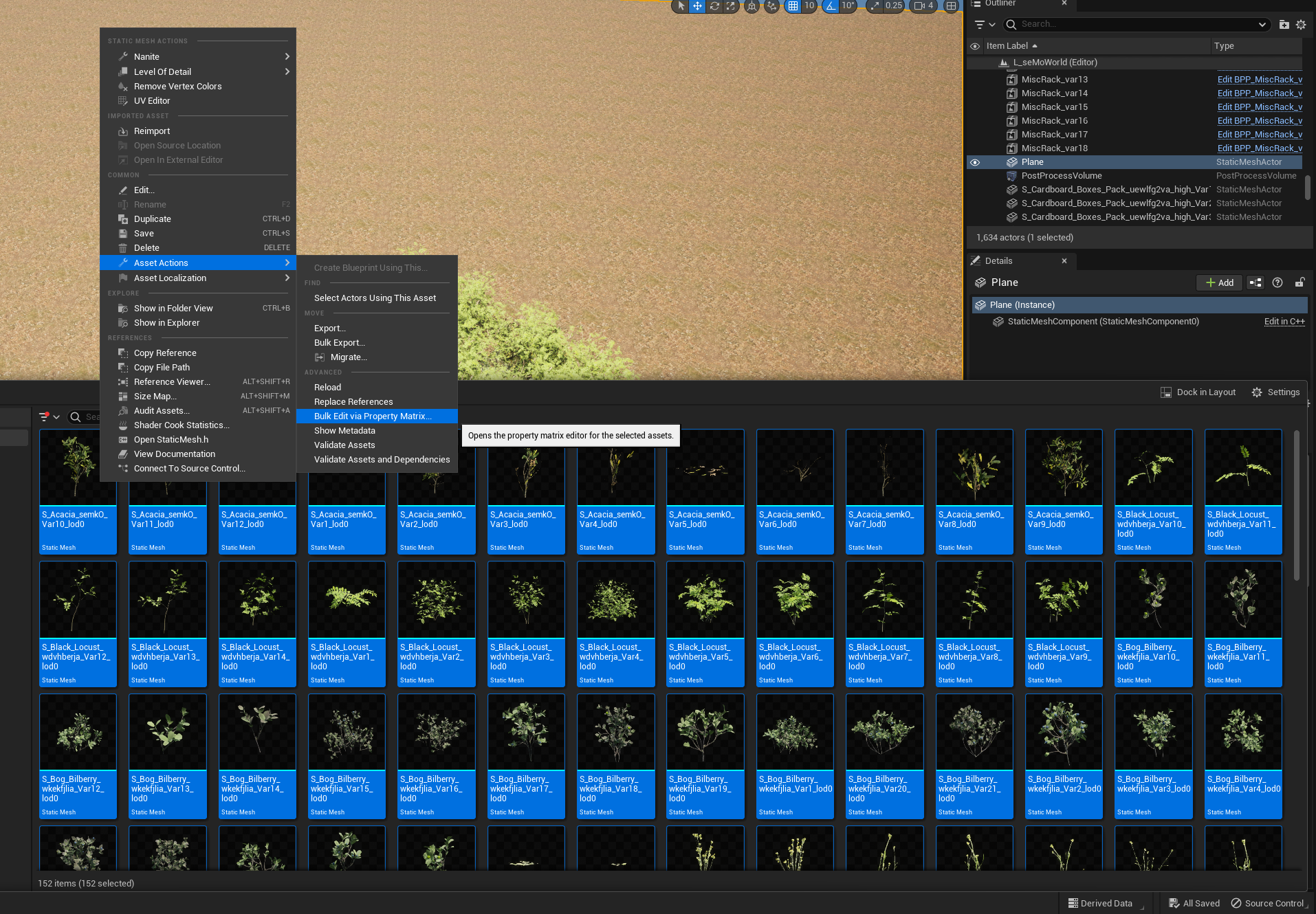 Content Browser에서 에셋의 Static Mesh들을 선택한 뒤, 우클릭 > Asset Actions > Bulk Edit via Property Matrix(프로퍼티 매트릭스를 통한 대량 편집)를 선택하자.