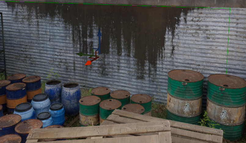 하지만 이 머티리얼이 굉장히 독특한데, 앞선 내용에서 언급했듯이 오브젝트는 Static Mesh + Material로 이루어져있다. 따라서 머티리얼을 스태틱 메시에 적용시키면 해당 스태틱 메시에서 머티리얼이 표현되는 것을 볼 수 있는데, 이 데칼 머티리얼은 Static Mesh에 구애받지 않고 데칼이 적용되는 공간에 있는 Static Mesh들에 영향을 준다. 위 사진에서 보면, 지붕과 공장의 벽은 여러개의 스태틱 메시와 머티리얼로 구성되어 있는데, Static Mesh의 갯수나 Material의 유무에 관계없이 그저 Decal이 표현하는 영역에 있는 Static Mesh라면 Decal이 여러개의 Static Mesh에 이어져서 해당 메시의 머티리얼 위에 덮어씌우는 형식으로 표현된다. 위 사진에서 초록색 Gizmo가 Decal의 영역이다.