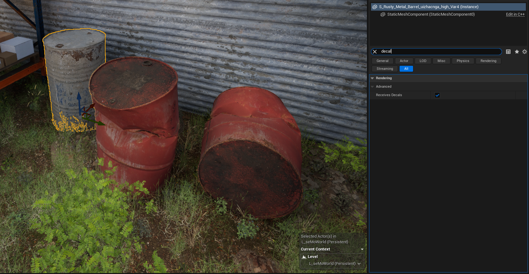만약 데칼의 영역수정으로 제외시키기 어려운 액터가 데칼의 영역내에 존재한다면, 해당 액터를 선택한 후 Details > Decal 검색 또는 Advanced > Receives Decals 설정을 풀어버리면 데칼의 영향을 받지 않는다.