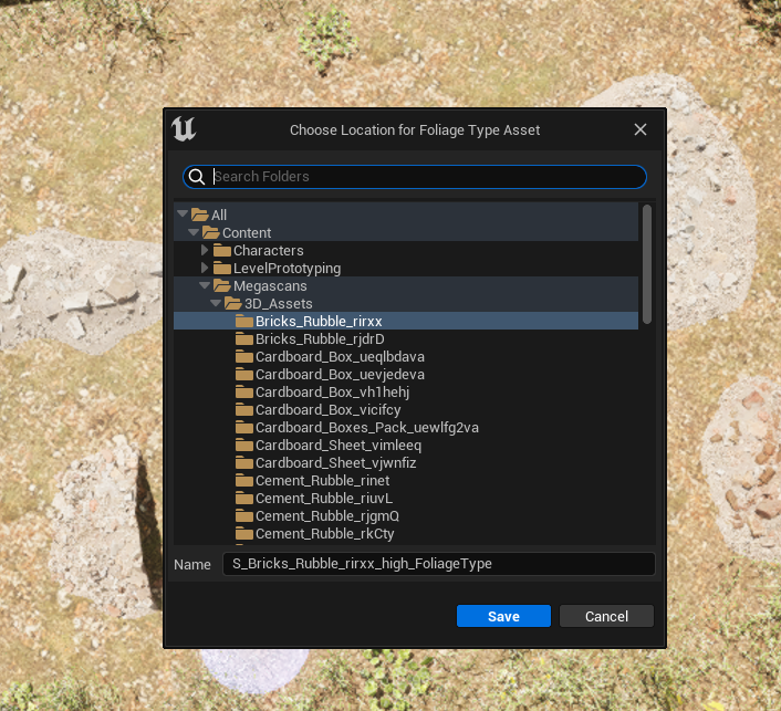 Foliage Mode에 추가할 때 이런 창이 에셋 갯수만큼 뜨는 것을 볼 수 있는데, 이것은 Foliage용 Static Mesh를 자동생성 하는 것이며, 자동으로 생성된 Static Mesh Foliage를 어느 위치에 저장할 것이냐를 묻는 것이다. 기본 설정으로 각 Static Mesh의 폴더가 지정되어 있으니 Save하여 계속 넘겨도 좋다.