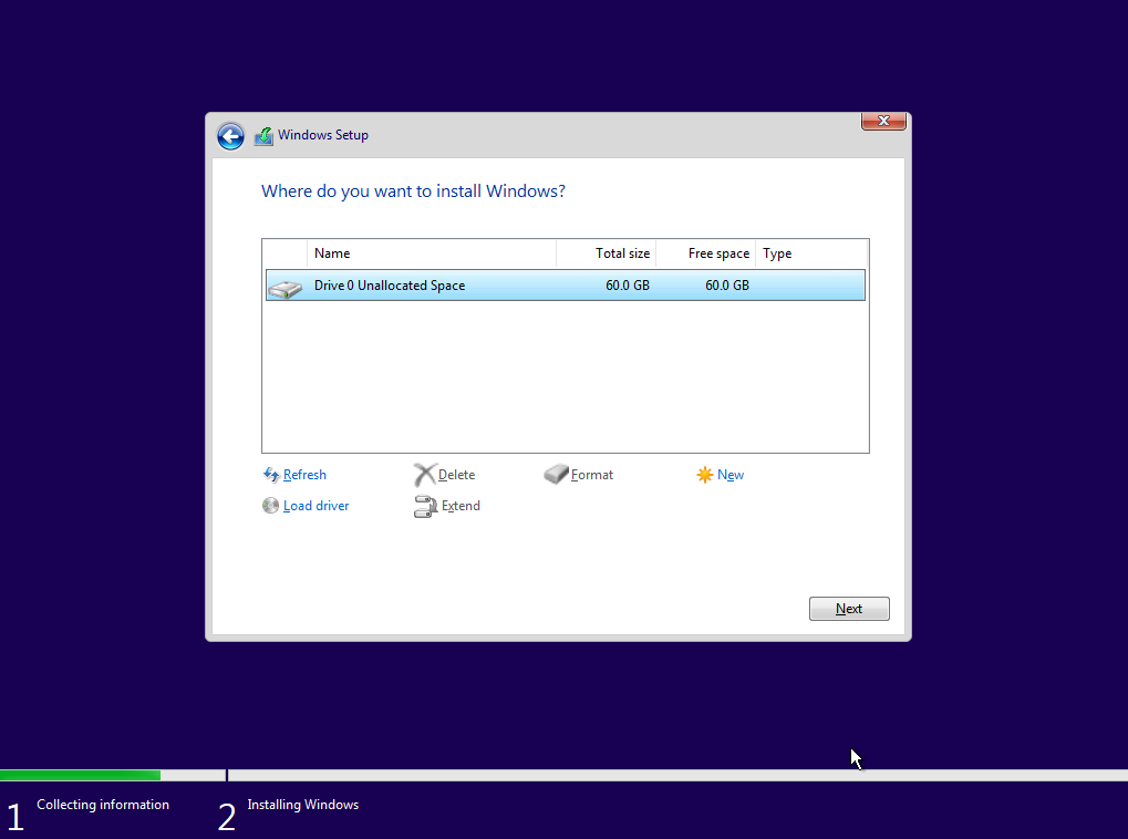 하드디스크 파티션이 나눠져있거나 하드디스크가 여러개라면, 위에 더 많은 목록이 표시될 것이다. Windows 10을 설치할 드라이브를 고르고 진행하면 된다.