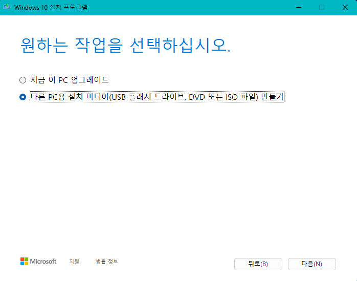 Upgrade 옵션은 윈도우 설치 미디어를 사용하여 컴퓨터를 켰다면 불가능하다.