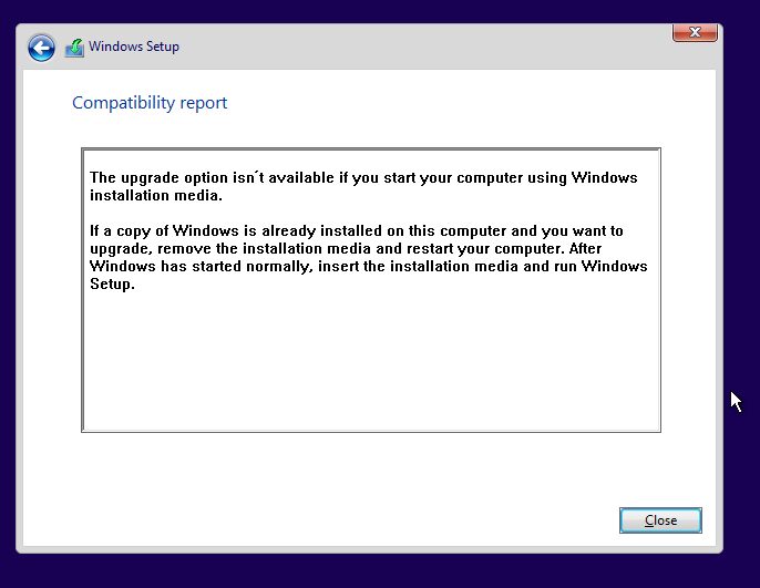 만약 윈도우 복사본이 이 컴퓨터에 설치되어 있고 업그레이드하고 싶다면 설치 미디어를 제거하고 컴퓨터를 재시작시키자. 윈도우가 정상적으로 시작되었다면, 설치미디어를 삽입하고 윈도우 설치마법사를 실행하자.